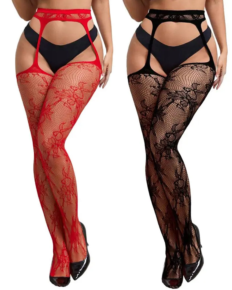 Elevate your legwear with these stunning floral lace suspender tights. Crafted from smooth, stretchy fishnet fabric and adorned with delicate floral lace panels, they combine vintage charm with provocative allure. Designed with a high waist and adjustable suspender straps, they offer a customizable fit that flatters every curve—perfect for layering under skirts, dresses, or denim for a bold fashion statement.