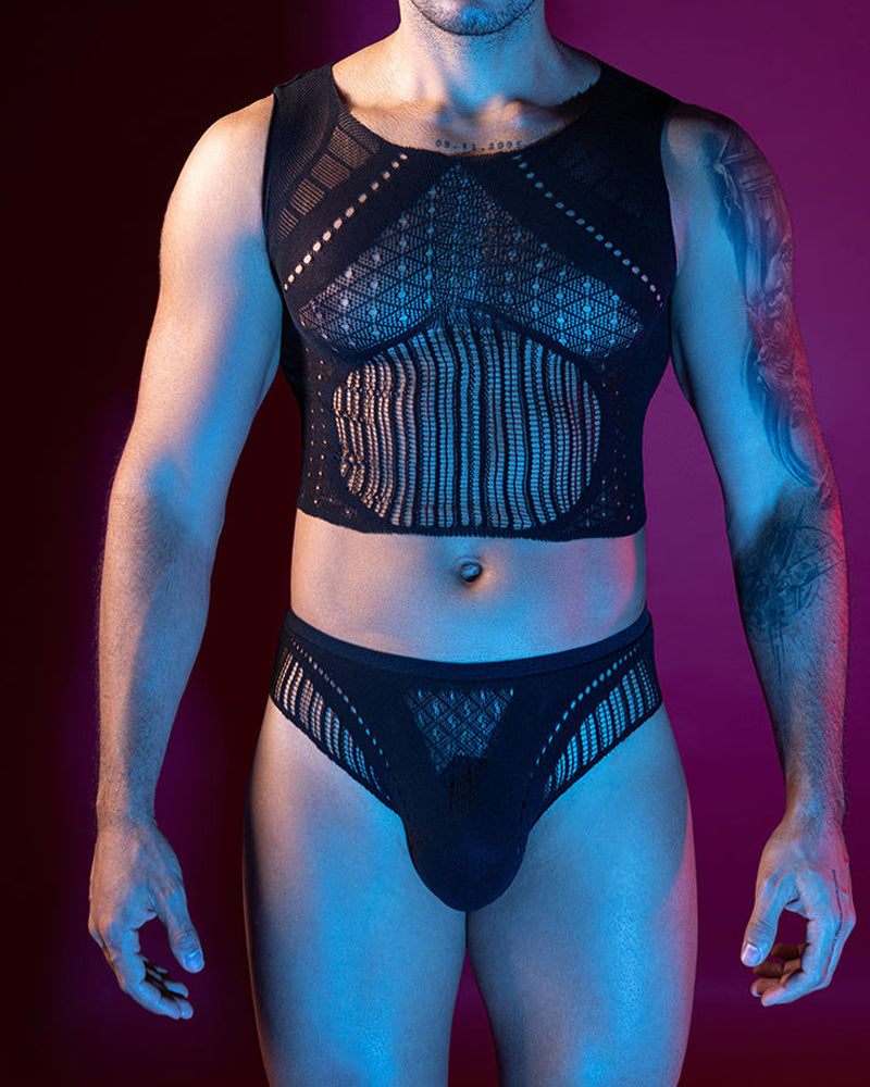 Explore bold self-expression with this provocative lingerie set. Designed with an all-over fishnet construction and strategic hollow-out panels, it combines edgy transparency with a comfortable, elastic fit. Perfect for intimate moments or confident showcases, this set redefines masculine allure with daring sophistication.
