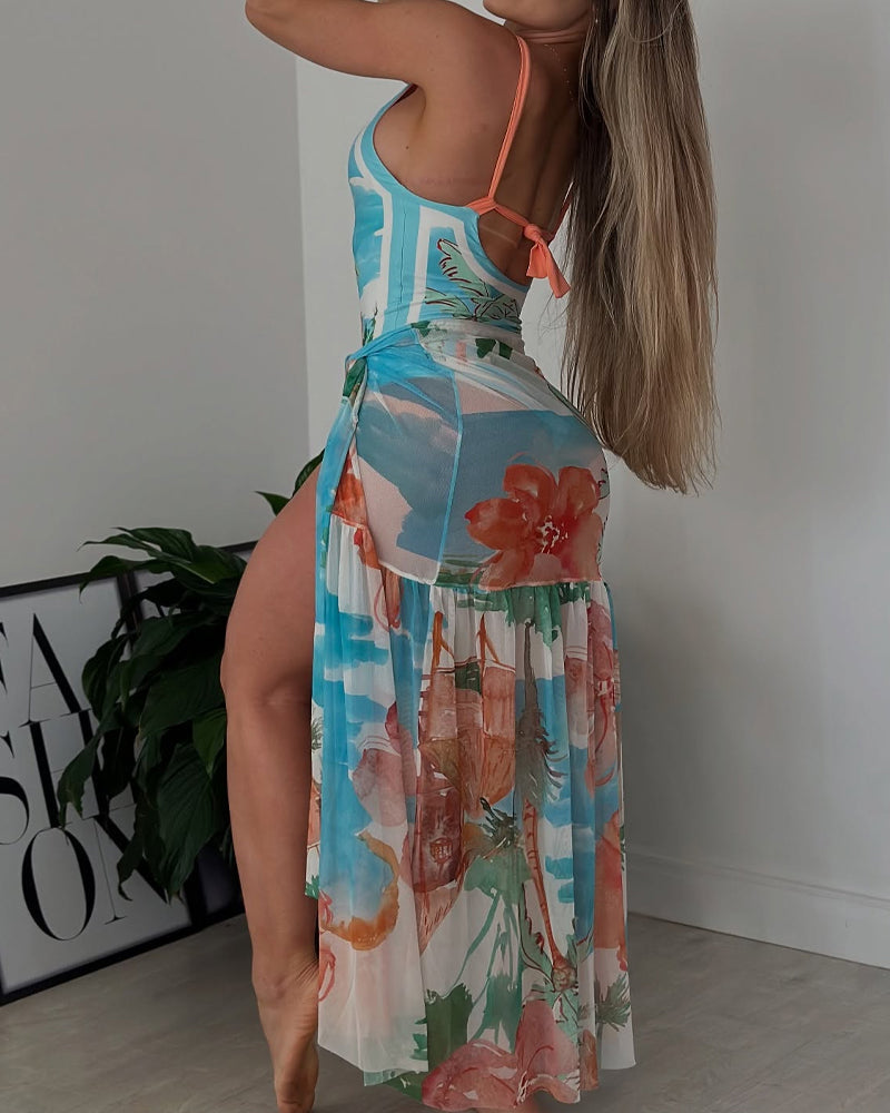 Retro Floral Colorblock Swimsuit and Cover-up Set
