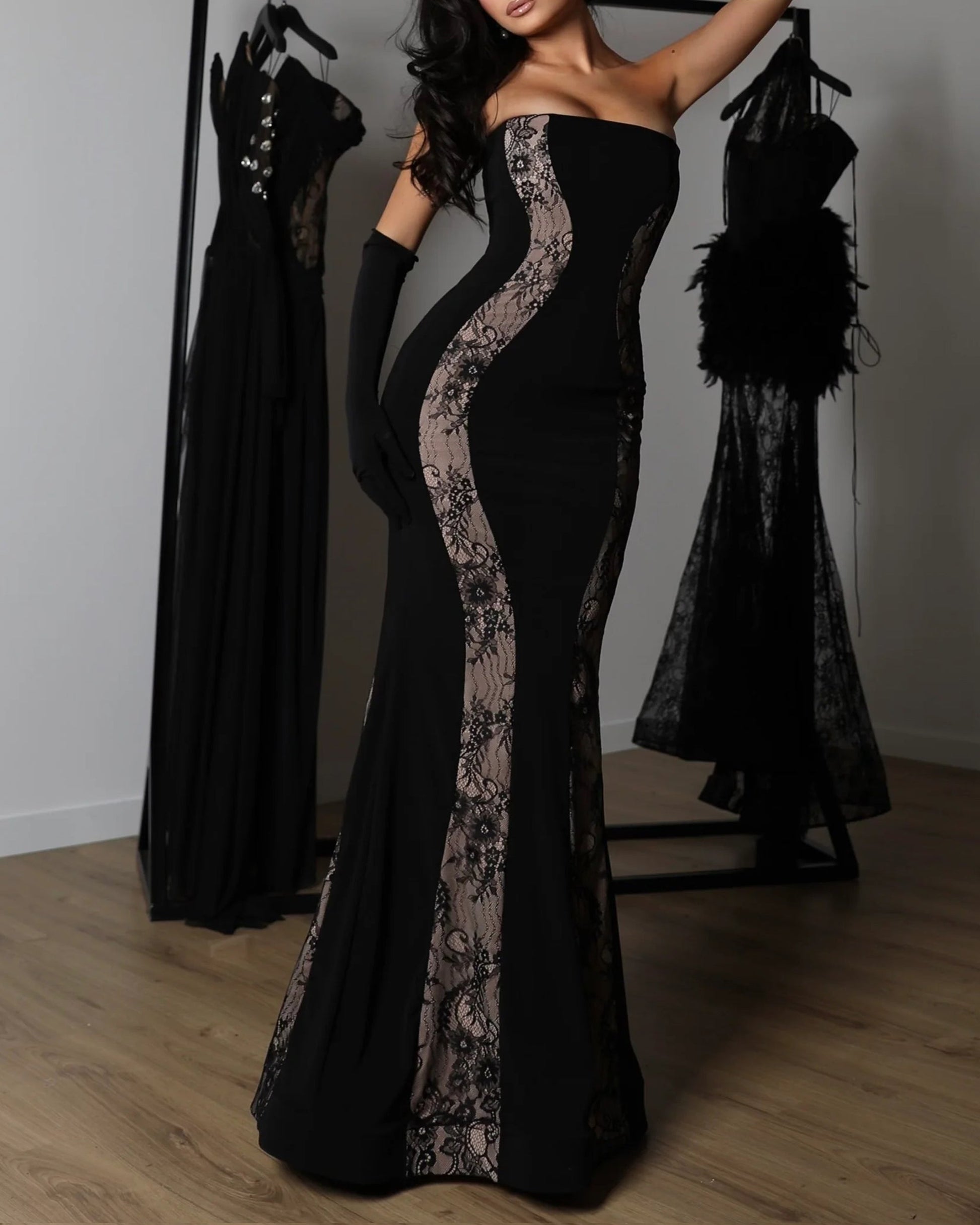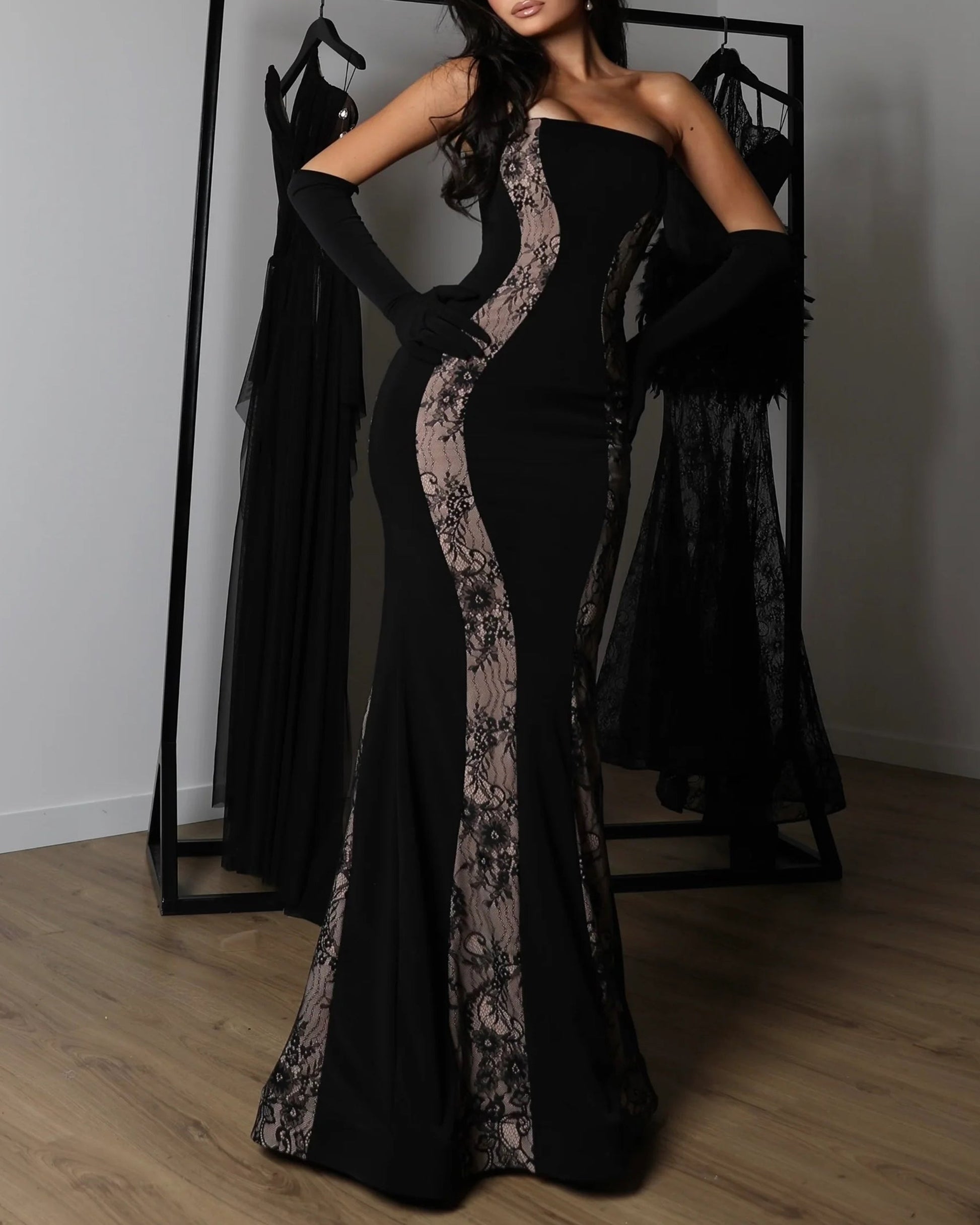 Embrace timeless drama in this breathtaking maxi dress. The off-shoulder chiffon neckline flows into a delicate lace-overlay corset, while criss-cross detailing sculpts your waist. A lace-framed thigh slit and sheer lace-back design create an unforgettable silhouette of elegance and allure.