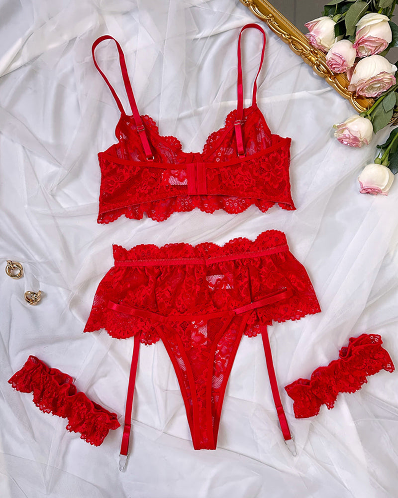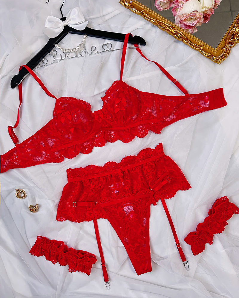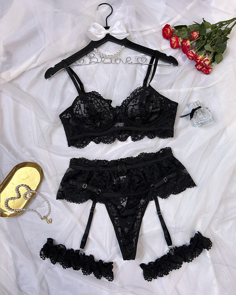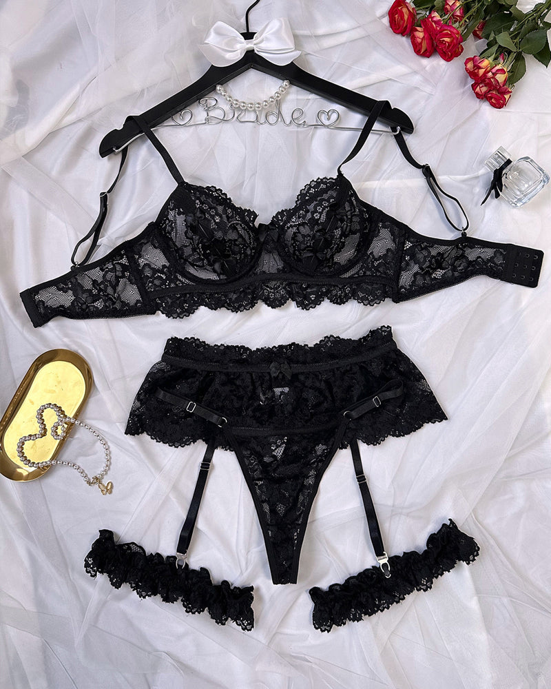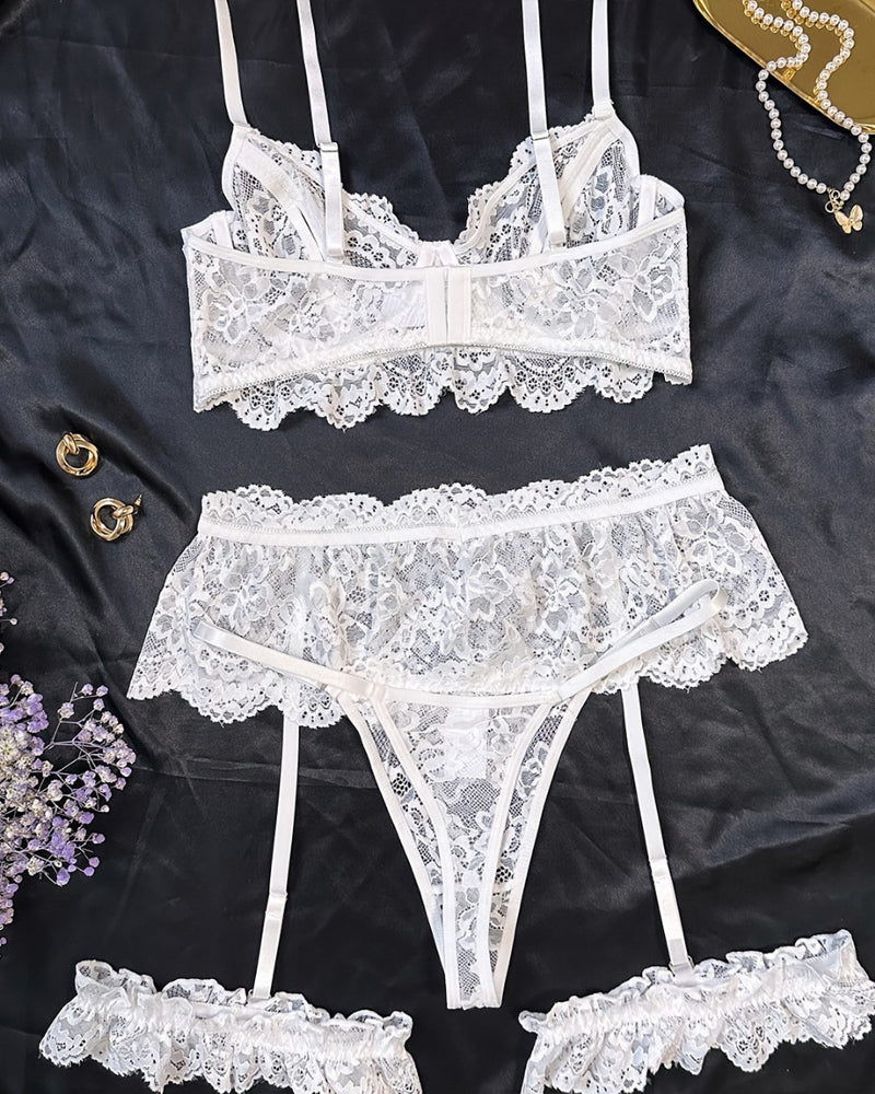 Sexy Floral Lace Mesh Underwire Bra Lingerie and Detachable Lace Thigh Garter Belt Set